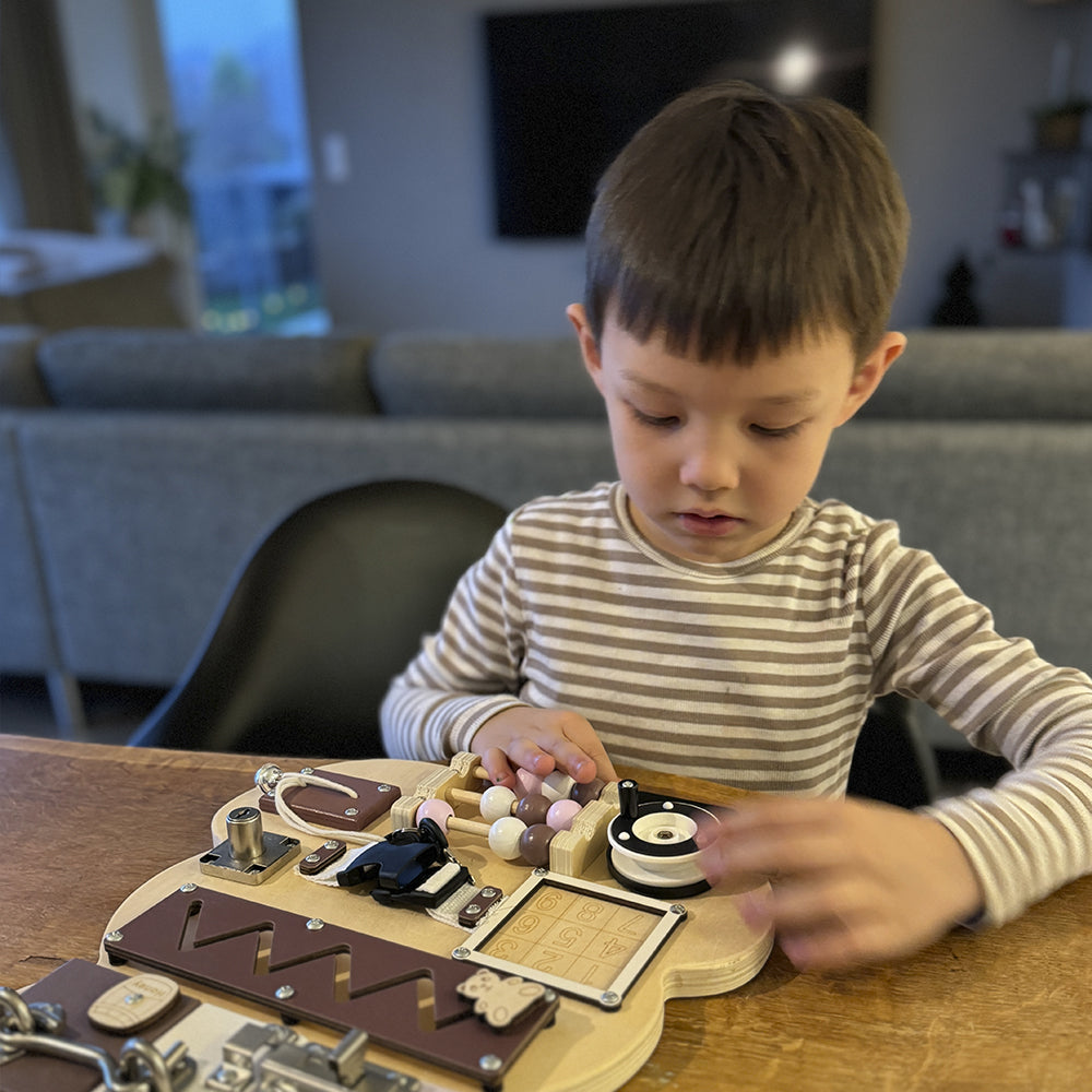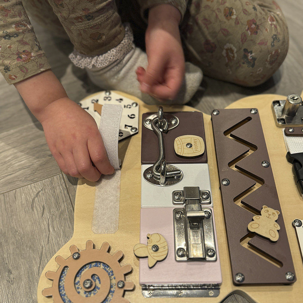 Fra drejeknapper og klikmekanismer til farverige snore, tilbyder BusyBoard en verden af lærerige legeaktiviteter, der udvikler finmotoriske færdigheder og tidlig logisk tænkning