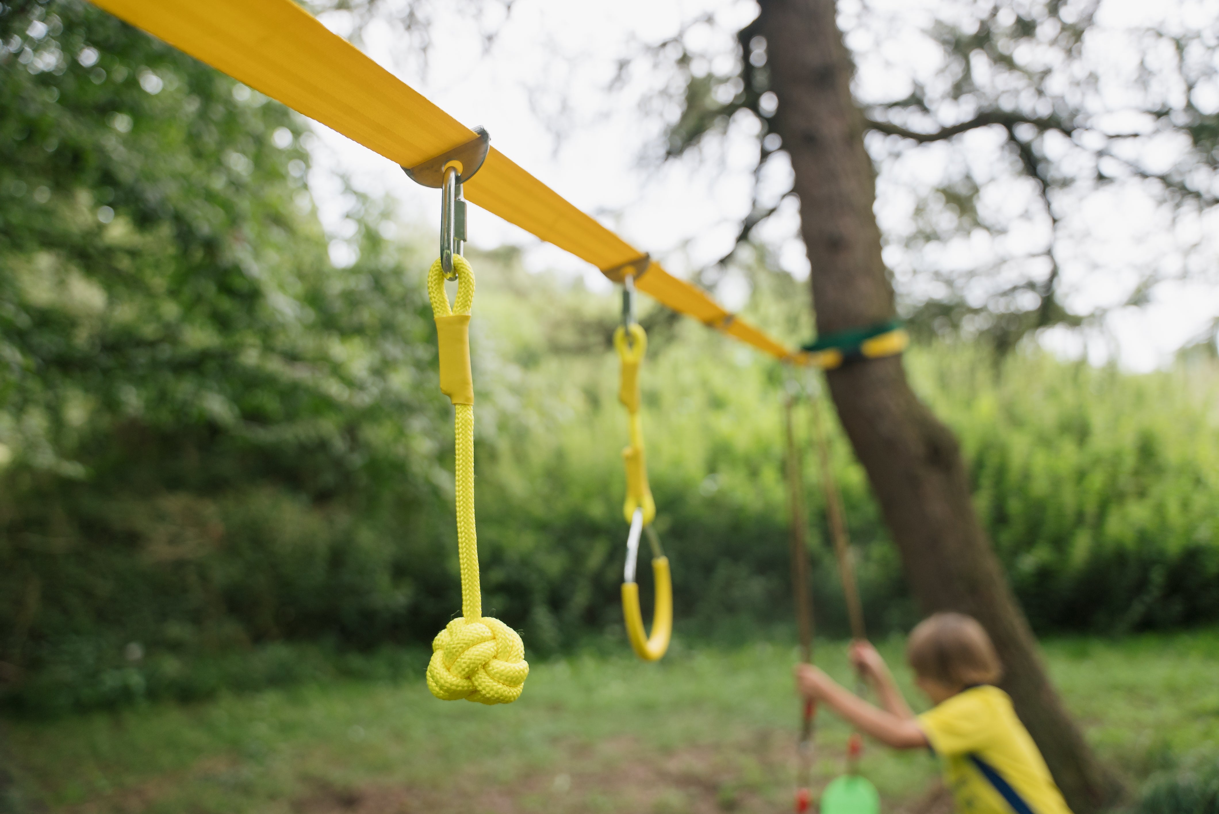 Det får I: 15 m slackline med ratchet, træbeskyttere, klatrenet, trapezstang, ringe og fleksibel rebgynge. Alt udstyr er i kraftige materialer og kan højdejusteres med karabinhager.